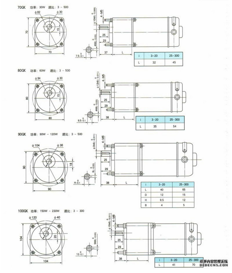 This series of reduction motors is composed of GK series square box gears coupled with various series of DC motors, and is processed using high-precision machining equipment and advanced technology. It has the characteristics of low noise and smooth operation. A reduction ratio of 3-500, combined with motors of different powers, can achieve ideal output torque. Please refer to the ZYT series permanent magnet DC motor for technical parameters of the motor; SZ series DC servo motor.